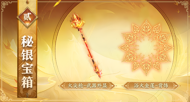 黄金奖池内含全新拍卖道具:武器幻化——“神器·火尖枪”碎片,背饰——“浴火金莲”碎片,获得可上架全区拍卖,全民暴富进行时!